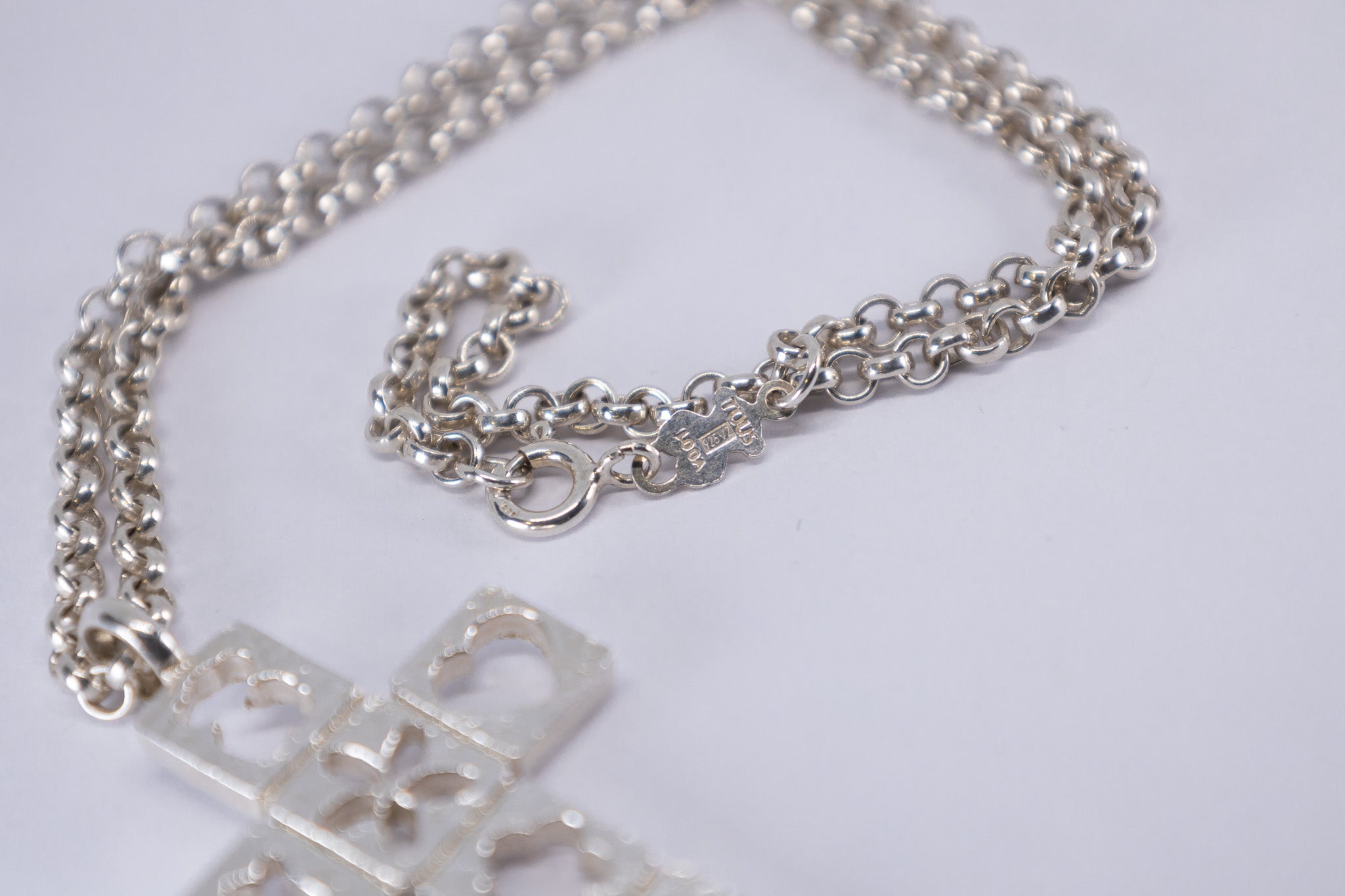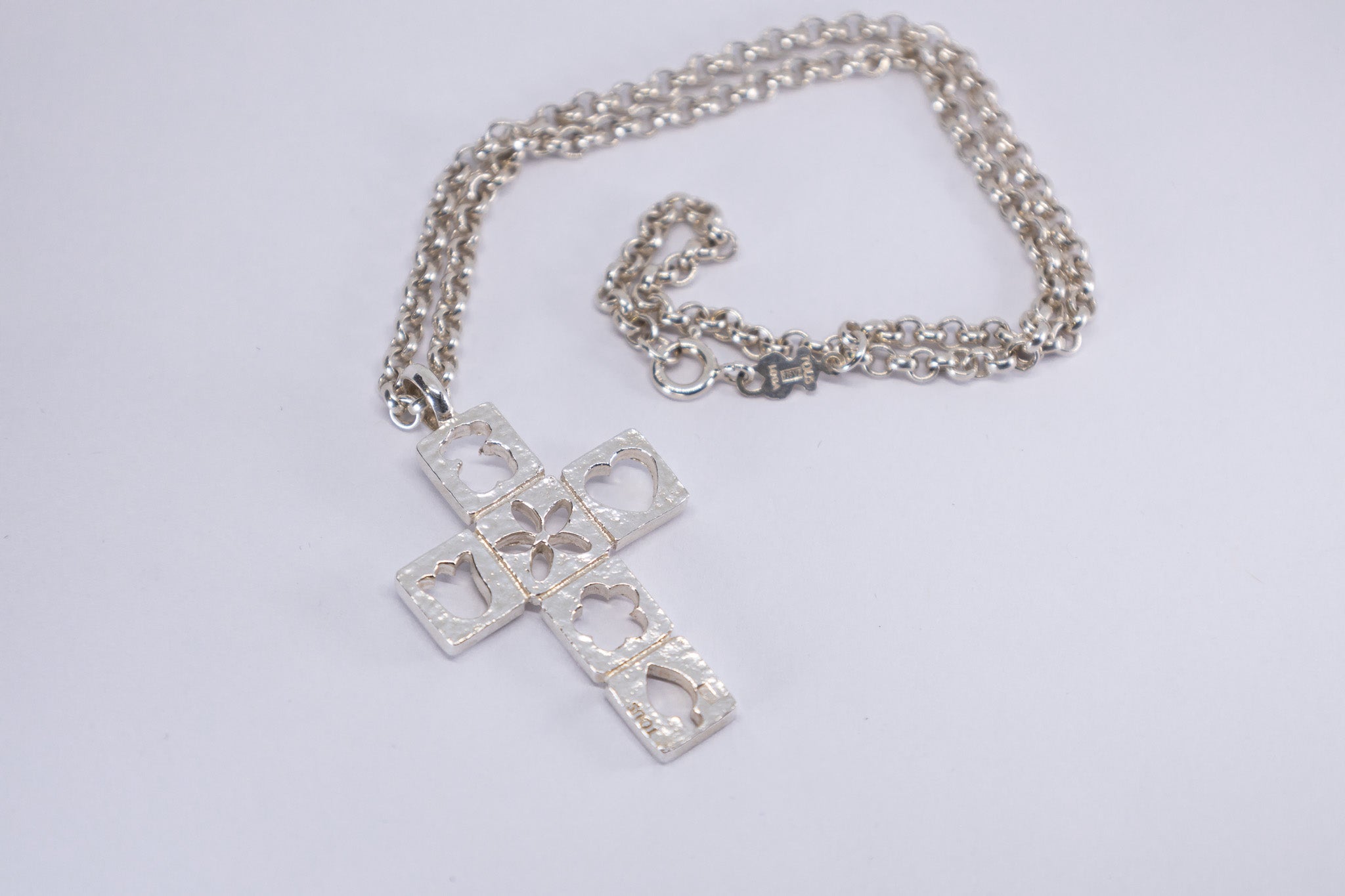 Cadena de eslabones gruesos con dije de cruz en plata de 3.5 cm, diseño único y original que incluye 6 logos representativos de la marca