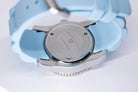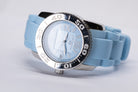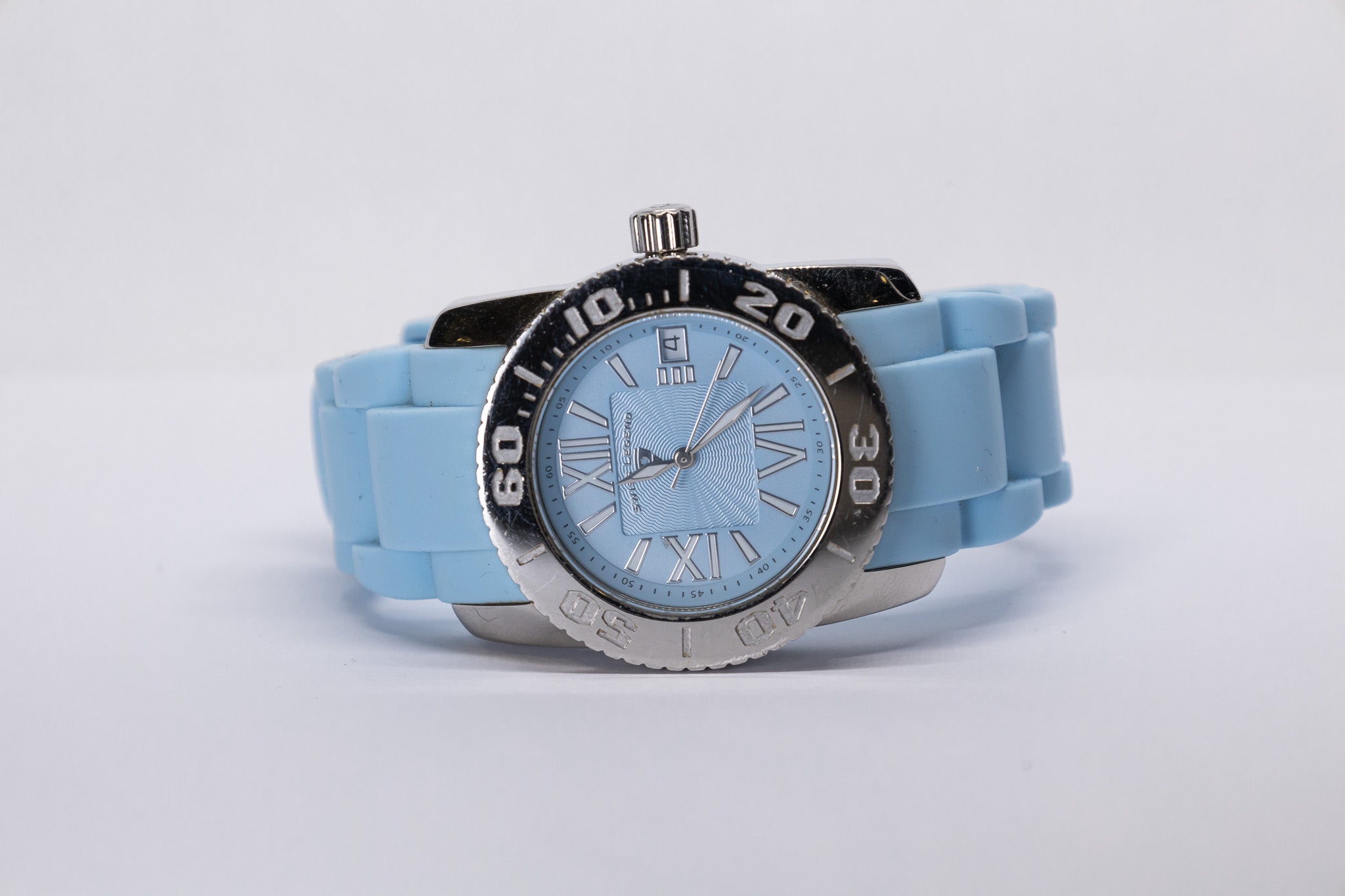 Reloj deportivo de caja redonda, correa de silicón, fondo de carátula en tono azul claro que combina con la correa, números romanos, bisel de acero y fechador